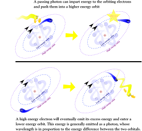 If you shoot a photon of a specific wavelength, it will cause the electron to go into a higher energy state for a while. and then the electron will jump back down , releasing a photon.